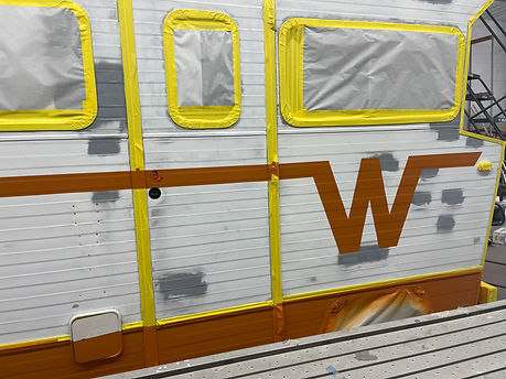 ...and then somehow to new southern pecan wood floors, a new Norcold fridge, Soft Candlelight paint throughout, and custom seat in progress! Oh yeah, and the faux alligator, marine-grade vinyl dash. Just sayin'.